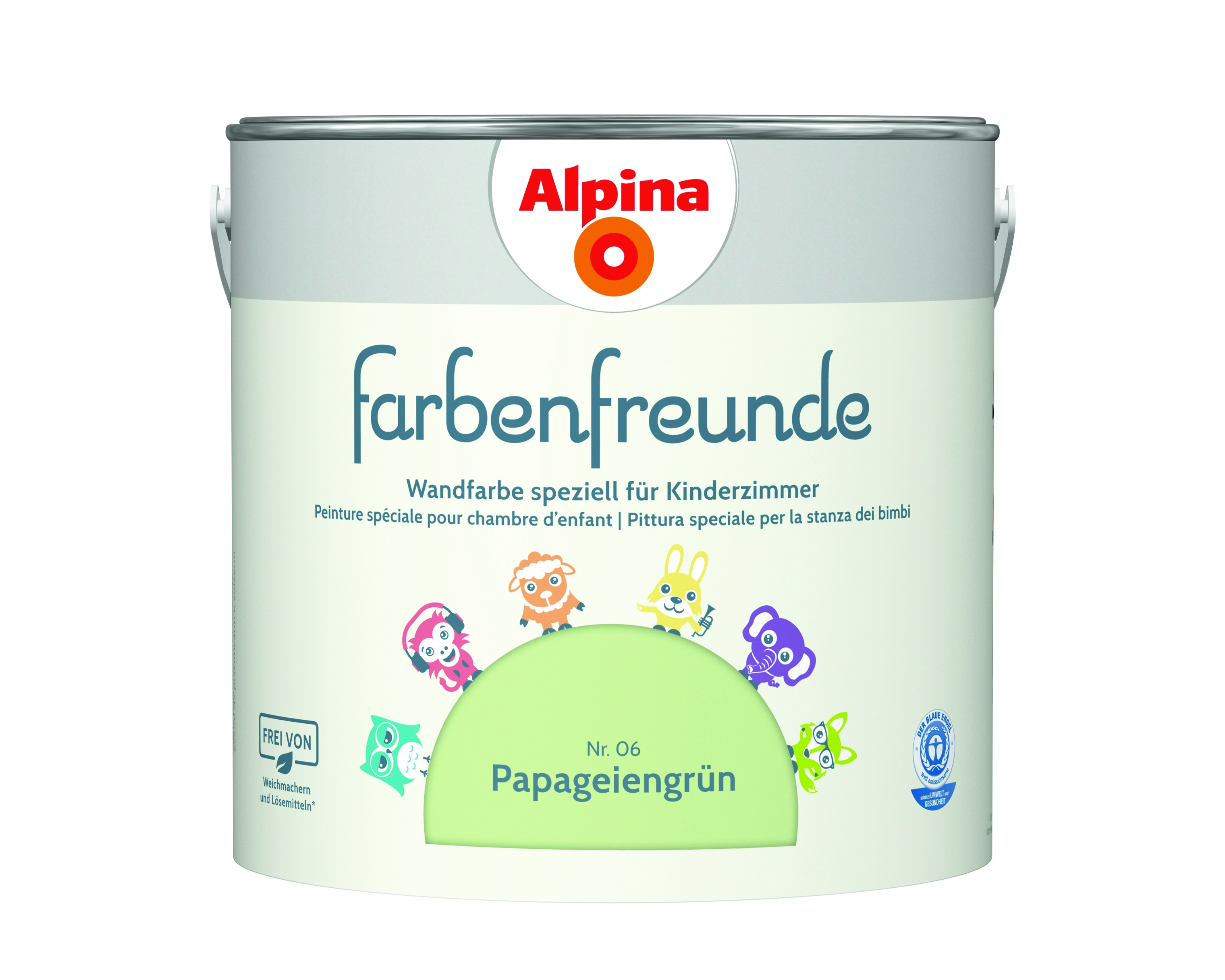 Alpina Farbenfreunde. Farbkonzepte speziell für Kinderzimmer entwickelt Kinderzimmer sind ganz besondere Orte. Hier wird gemalt, gebastelt, gespielt und getobt. Gleichzeitig ist das Kinderzimmer aber auch ein Ort zum Entspannen und Träumen. Um all diesen Ansprüchen gerecht zu werden, hat Alpina die Farbenfreunde entwickelt. Die 24 ausgewählten Farbtöne sind speziell auf die Bedürfnisse von Babys und Kindern ausgerichtet und unterstützen ihre Entwicklungs- und Lernprozesse. Die Alpina Farbenfreunde Wandfarben werden unter Beachtung höchster Standards für Umwelt und Gesundheit hergestellt. Die Wandfarben sind mit dem Blauen Engel ausgezeichnet und enthalten keine Weichmacher und keine Lösungsmittel. Ideal für ein gesundes Raumklima.