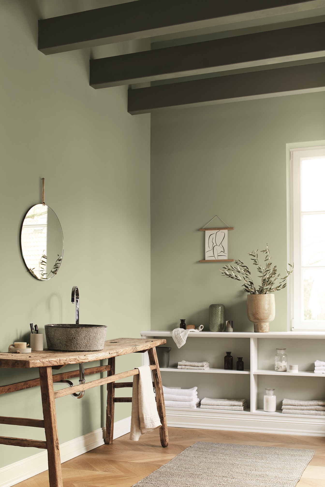 Umgeben von anderen Farben und Materialien aus der Natur fühlt sich diese Nuance am wohlsten. Rustikales Holz, Accessoires aus Steinzeug und Keramik, Teppiche in Naturtönen und Textilien aus weichem Leinen sind ideale Begleiter. Für zusätzliche Auflockerung sorgen weiße Komponenten.
